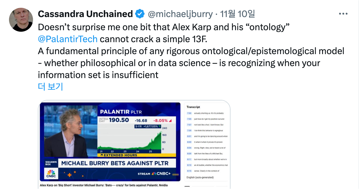 이 같은 버리의 공매도 베팅 소식은 팔란티어의 3분기 실적 발표일에 맞춰 공개됐는데요. 팔란티어는 3분기 매출이 전년 동기 대비 63% 급증했고 연간 매출 전망도 상향 조정했지만, 주가가 과도하게 높다는 버리의 메시지에 투자자들은 주식을 투매했습니다. 팔란티어 CEO 알렉스 카프는 "칩과 온톨로지를 공매도하는 것은 미친 짓"이라며 반박했지만, 버리는 X를 통해 "카프와 그의 온톨로지가 13F 보고서조차 해독하지 못한다"라며 응수했죠.