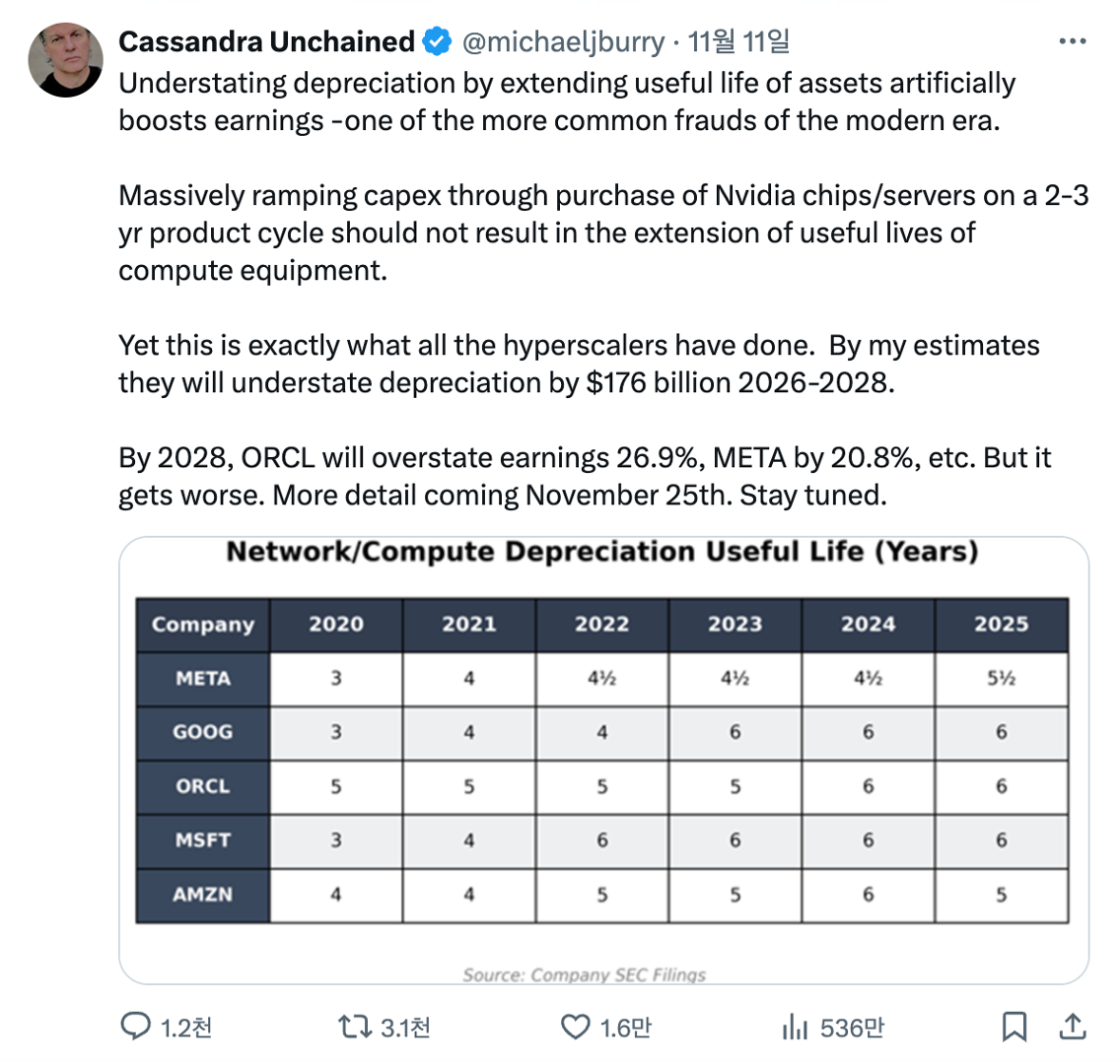 버리는 11일, 하이퍼스케일러들이 AI 데이터센터의 GPU 칩 유효 수명을 과도하게 늘려 감가상각 기간을 연장하는 방식으로 회계상 이익을 부풀리고 있다고 주장했습니다. 그는 "엔비디아의 칩과 서버처럼 2~3년 주기로 교체되는 장비를 대거 구입하면서도, 자산의 수명을 연장하는 식으로 회계 처리하고 있다"라며 "이는 현대 회계에서 가장 흔한 이익 부풀리기 수법"이라고 비판했는데요. 버리는 이런 방식으로 2026~2028년 하이퍼스케일러의 회계상 이익이 약 1,760억 달러 과대계상됐다고 주장하며, 특히 오라클과 메타의 이익이 2028년 기준 각각 27%, 21% 과대 계상될 수 있다고 지적했죠. 구글과 마이크로소프트, 오라클 등 주요 하이퍼스케일러는 엔비디아 AI 칩의 감가상각 기간을 최대 6년으로 잡고 있지만, 실제로는 훨씬 더 빨리 진부화될 수 있다는 겁니다. 만약 GPU의 유효수명이 감가상각 기간보다 짧다면 현재 추정되는 기업이익과 주가도 과대평가됐을 수 있는데요. 버리가 이 문제를 제기하면서, 월가에서도 관련 기사와 분석 보고서가 쏟아져 나오기 시작했죠.