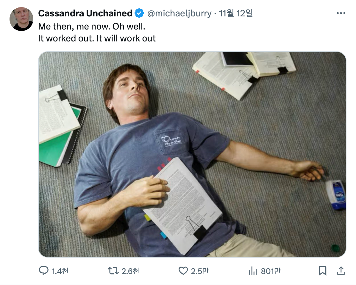 하지만 버리의 투자 방식은 높은 변동성과 리스크를 동반합니다. 12일 버리는 영화 '빅쇼트'에서 자신을 연기한 크리스찬 베일이 서류에 둘러싸여 바닥에 지친 모습으로 누워있는 장면을 게시하며 "그때의 나, 지금의 나. 뭐, 어쨌든. 잘 해결됐어. 또 잘 해결될 거야"라고 적었죠. 이는 현재 AI 공매도 포지션으로 인한 스트레스를 암시하는 동시에, 결국 자신이 옳았음이 증명될 것이라는 확신을 드러낸 것으로 해석됩니다.