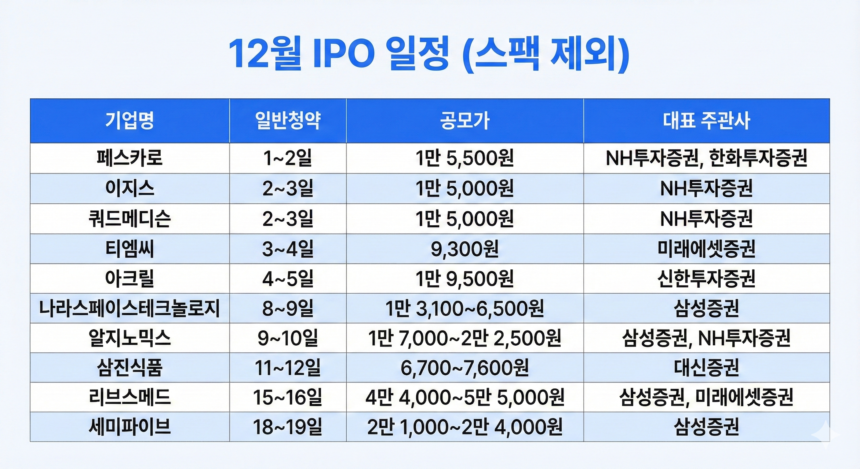 🤯 청약 일정 폭주 현상: 다만, 연말에 상장을 목표로 하던 기업이 한꺼번에 쏟아지면서 12월 IPO 시장은 사실상 포화 구간에 진입했습니다. 페스카로·이지스·쿼드메디슨·티엠씨·아크릴 등 10개 기업이 이달 일반청약을 진행했거나 앞두고 있는데요. 한 주에만 5개 기업이 몰리기도 했죠.