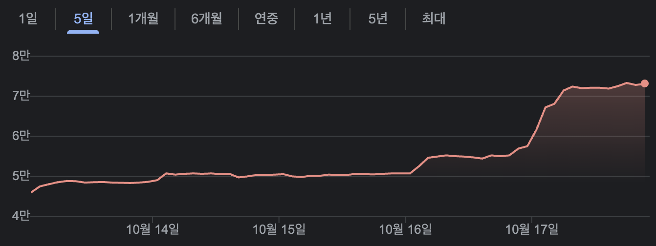 급등세: 10/17 7만원대로 25% 넘게 급등, 최근 1주 +57%