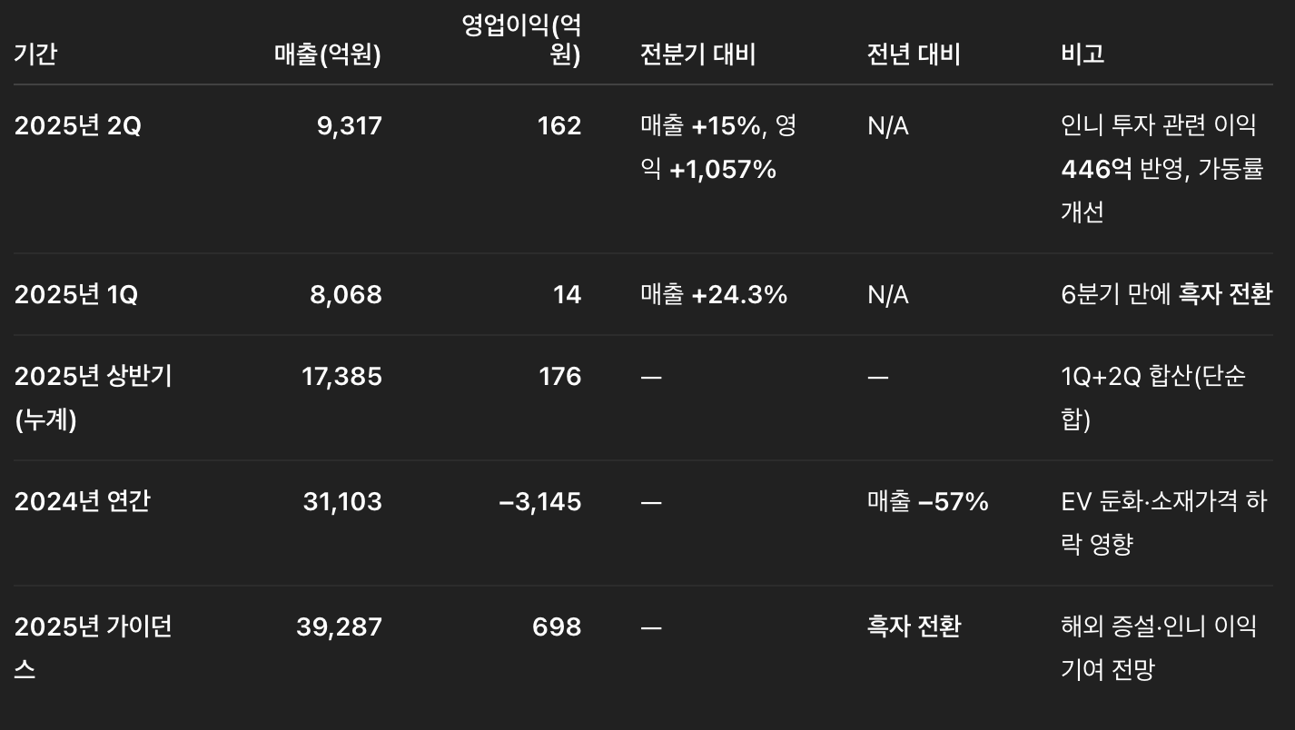 ’24년 큰 폭의 적자 이후, ’25 1Q·2Q 연속 흑자 전환이 확인됐습니다. 중요한 건 흑자가 ‘일회성’이 아니라 구조적 개선으로 이어지는가인데, 인니 이익 기여 + 원자재 안정 + 환율 우호 + 재고관리 개선이 복합적으로 작용했어요. 가동률이 오르면 제조고정비가 희석되므로, 매출 증가 대비 영업이익 레버리지가 커지는 특징이 있습니다. ’25 가이던스(매출 3.93조/영익 698억)는 ‘적자 탈출’에서 ‘이익 체질’로 가는 과도기를 의미합니다.